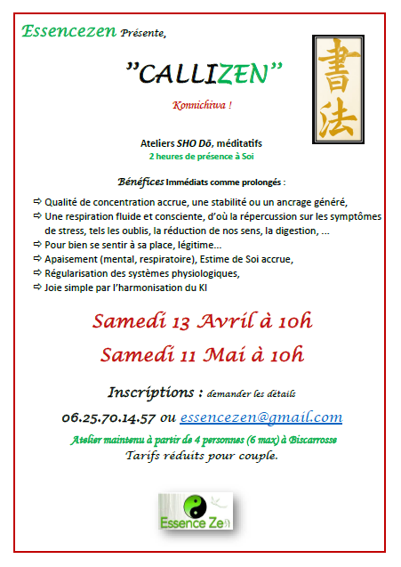 Principe : Riche d’une pratique de zazen depuis plus de 20 ans je vous propose un autre atelier méditatif basé sur le modèle Zen ; c’est-à-dire la présence à soi, dans l’instant.